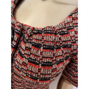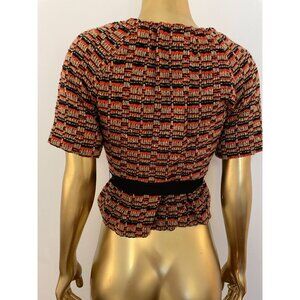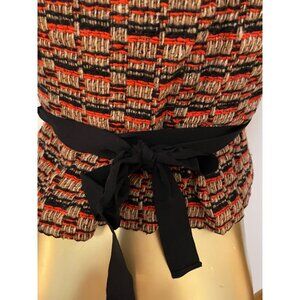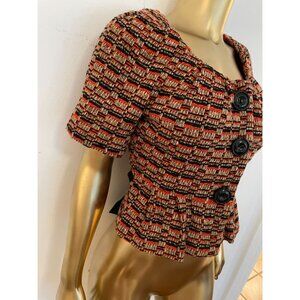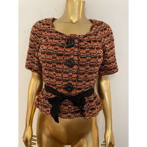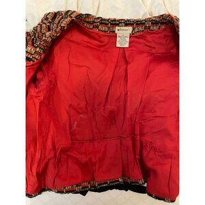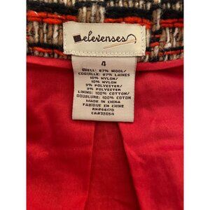 This Y2K Anthropologie Elevenses jacket blazer exudes timeless elegance with its classic red and black woven pattern. It features a belted waist, emphasizing a feminine silhouette.