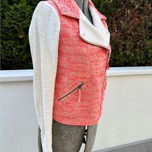 Anthropologie Elevenses neon orange with ivory sleeves Tweed Knit Jacket SZ 2. There is a spot on the left sleeve (see picture) and a small hole on the right arm (picture looks worse than it really is). Overall a super cute jacket with a lot of wear left.