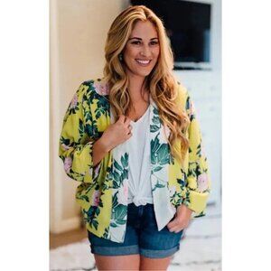 Anthropologie Elma Yellow Green Pink Floral Open Front Boho Kimono Top One Size