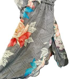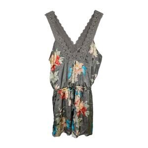 Anthropologie Eloise Lela Lace Romper. Satiny sleep romper. Gray with floral print. Elastic and drawstring waist. Side slits with scalloped details. Luxe loungewear.
