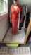 Features: long sleeves, V neck, button up front, flutter hem, matching belt, orange/ rust color