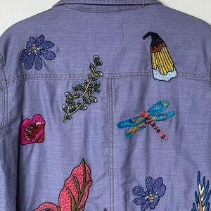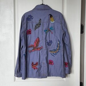 Excellent condition like new So cute! Just one size too big for me. Lightweight, Embroidered with multi colored motifs - including flowers, animals and insects - it is a definite eye catcher and wish it fit me. Some of the photos are darker than jacket actually is - I think from when I shot further away. The ones shot close up are a more accurate depiction of color. The denim is a gorgeous lavender color and embroidered with flowers, plants and dragon flies and a very cute frog. There are patch pockets on either side of the button opening and inside along the waist is a draw string so you can contour your waist.