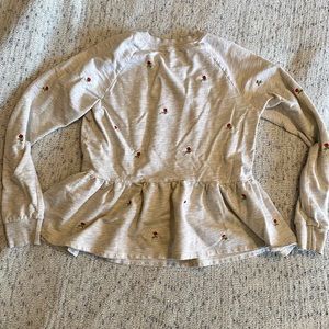 Great condition Anthropologie sweatshirt. It has an unique peplum shape combined with a nice sweatshirt material and adorable embroidered roses.
