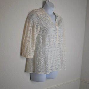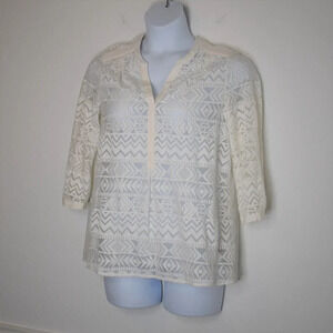 Pre-owned, good condition. No visible holes or stains. Normal signs of wear. Anthropologie Vanessa Virginia. Neutral cream embroidered fabric. Gorgeous boho geometric embroidered over sheer fabric. V-neckline. Pop over style. 3/4 sleeves with button cuffs. Contrast sheer fabric panel on back. Ribbon appliques on neckline, shoulders and cuffs. Perfect to wear to the office with slacks or a skirt, or with jeans for a more casual look. Size per tag: US 12. Fabric: Front Panel: 66% Cotton/ 34% Polyester. Back Panel: 100% Polyester. Size per tag does not guarantee desired fit, please see pictures for measurements.