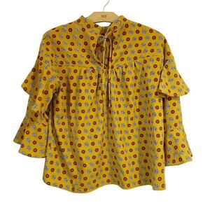 Anthropologie Eri + Ali Women Blouse Vintage Gold Floral Tiered Sleeve Loose Fit