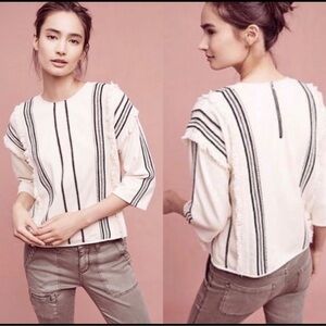 The Anthropologie Eri + Ali Women's Top in Medium is a stylish and trendy topthat features a cream color with black accents and fringe details. This boho top has a 3/4 sleeve length and is designed for regular fit. Perfect for adding a touch of bohemian chic to any outfit, this top is versatile and can be dressed up or down for any occasion. Measurements are approximate laying flat, Chest 21" and Length 20".
