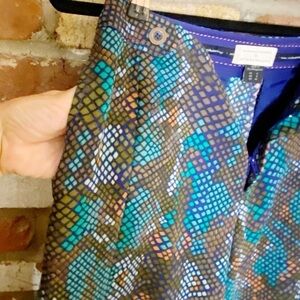 Great condition. Anthropologie The Essential Culottes. Green snakeskin motif. Cropped, wide leg fit. Front slant, back welt pockets. Size 2