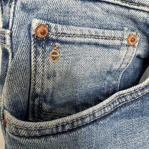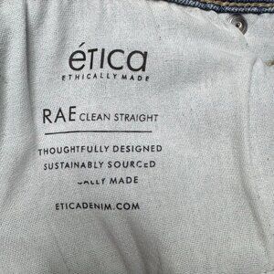The Etica RAE Clean Straight Jeans From Anthropologie are Made in Mexico and constructed in 95% Cotton 4% Elasterell-P 1% Spandex med blue wash denim twill fabric. They feature a high rise, button zip fly front closure, 5 pocket design and a straight ankle length silhouette. These are classic, coastal, preppy, office, casual, closet staple, timeless quiet luxury, capsule wardrobe, minimalist vibes.
