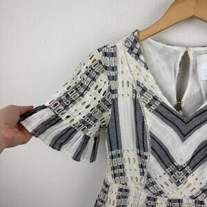 Cream & gray, 100% cotton, lined, zippered + keyhole back with button closure, pockets, short ruffle sleeves, v-neck, size 2.
