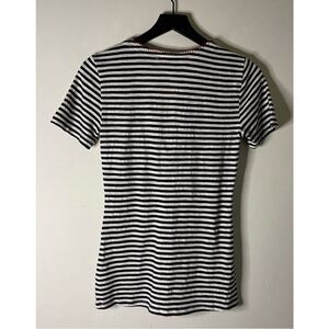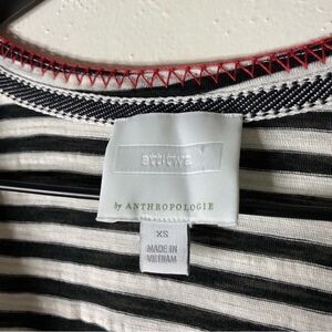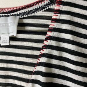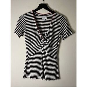 Twist Front t-shirt from Ett:twa by Anthropologie. Short sleeves. V-neckline. Black and white stripes with red stitch detail. Size XS. Good preowned condition with no tears or stains.