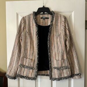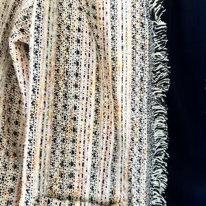 Eva Franco for Anthropologie ‘Reston’ Multi-coloured tweed jacket with fringe trim. Fully lined. Some very minimal pilling under the arms but it is not obvious when wearing the jacket. #tweedjacket