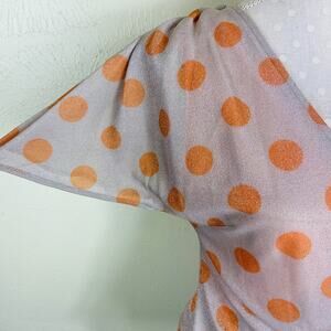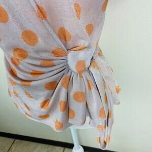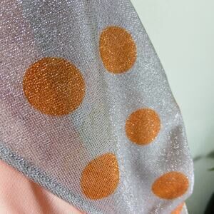 Silver metallic fabric with tangerine polka dots. Fully lined with pastel orange tank.