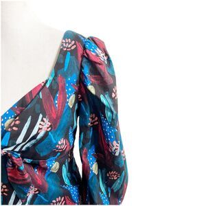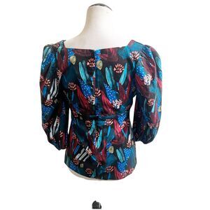 This Anthropologie blouse by Eva Franco in size 6 features a tropical design with a sweetheart neckline and puff sleeves. It has a zip closure and adjustable neckline tie accent. The blouse is made of 100% cotton with a polyester lining, adding to its bohemian style. Perfect for women looking for a unique and stylish top with a touch of tropical inspiration. Farm Rio Vibes
