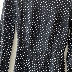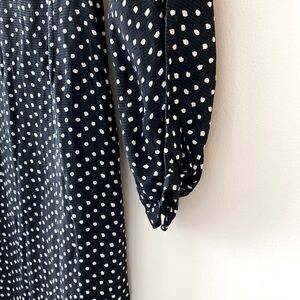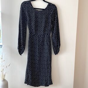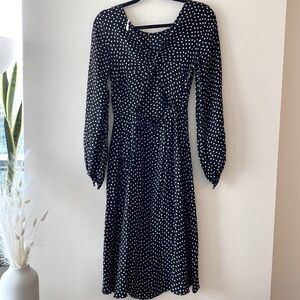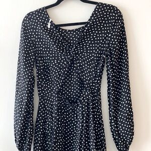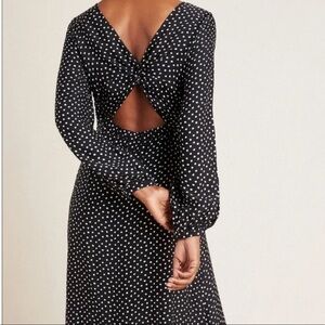Featuring a timeless polka dot print, long blouson sleeves, fitted waist and loose flowy skirt. Flattering wide neck silhouette and turns to reveal a twist cutout open v-back - an oh so sultry finishing touch!