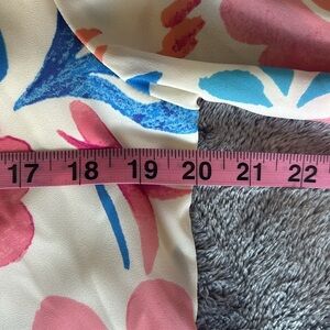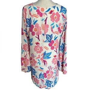 Vibrant floral dress with a V-neck design. Features pink, blue, and orange patterns on a white base.