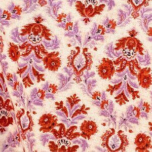 Indian block print, beautiful shades of a rusty red brown and lilac/lavender floral print with lace insets along the sleeves. V-neck, elastic sleeve cuffs, drop shoulder ranglan style sleeve. 100% Cotton, Made in India, block print, hand wash. Woven non stretch 100% cotton natural fibers.