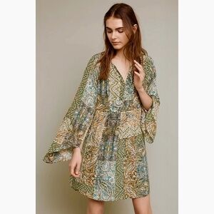 Anthropologie FLOREAT Amelie Silk Kimono Dress Green Abstract Paisley Size 2