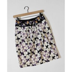 Wide defined waistband …with an embroidered & sequined circle pattern ~ Pleating in the middle of the waist … front and back ~ Straight hemline ~ Concealed side zipper ~ Fully lined ~ 100% silk fabric ~ Main print is a patchwork or color block pattern with circles or “bubbles” in various shades of purple, black & white … sequins at waistline have some gold as well