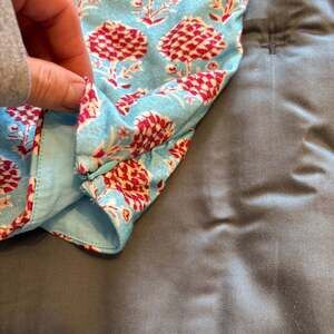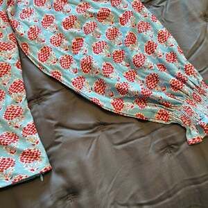 Anthropologie FOREVER THAT GIRL Puff-Sleeve One-Shoulder Blouse, US Size 10. This stylish blouse features a unique floral print in red and white on a light blue background, with a modern one-shoulder puff-sleeve design. Perfect for a chic casual or semi-formal look. Excellent pre-owned condition, no stains or holes.