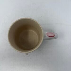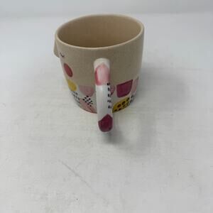 Whimsical Anthropologie ceramic mug featuring a sculpted face design with raised nose, closed eyes, and rosy cheeks. Accented with playful abstract painted dots in pink, yellow, white, and black for a modern, artsy vibe. Perfect for coffee, tea, or hot cocoa — also doubles as a charming display piece for a boho or eclectic kitchen.