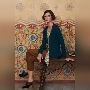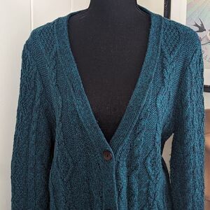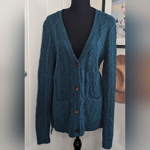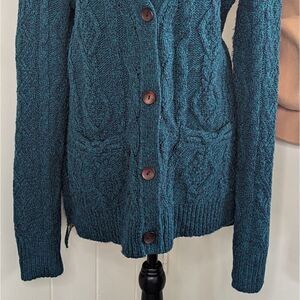 Description: Anthropologie Far Away From Close Pauline Teal Cable Knit Wool Cardigan L Dark Academia Romantic Preppy Cozycore four front buttons with extra button and thread, two top slip pockets, ribbed cuffs and hem, grosgrain ribbon trim at the hem, pintuck detail on the back