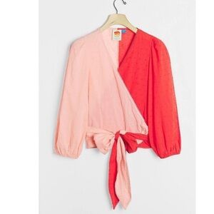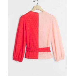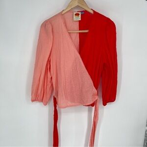 Anthropologie Farm Rio Colorblock Wrap Blouse Textured Pink Red Tie Waist
