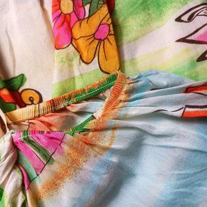 Achieve that retro-chic, Lana Del Rey inspired look, with this number! A gorgeous off-shoulder dress which features an artsy print. This maxi dress has a neck tie detailing and a relaxed fitting. The rayon-silk blend dress has a low, pleated skirt. Pair with a dainty necklace and summer sandals.