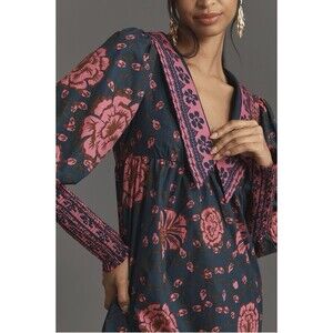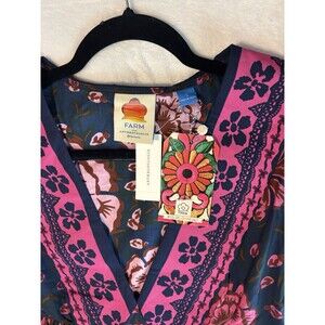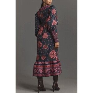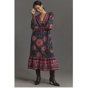 Anthropologie Farm Rio Puff Sleeve V Neck Midi Dress Sz Lg Purple Pattern