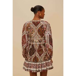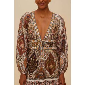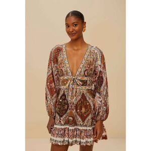 Made from 100% cotton, this mini flaunts a plunging v-neckline finished with a tie detail, subtly puffed sleeves, a ruffle hem, and a signature Farm Rio print.100% cotton; 100% cotton liningMini lengthPlunge neckline with tie detailSubtly puffed long sleeves with elastic cuffsSide seam pocketsRuffle hemBack zipMachine washImportedFarm RioBrazilian lifestyle brand FARM Rio has been celebrating bold colors and vibrant prints through its thoughtfully crafted, contemporary designs since 1997.