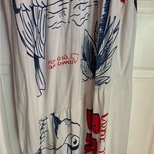 Vibrant Anthropologie Farm RIo dress featuring a Brazil graphic with a toucan and bold red accents. Perfect for a casual day out.