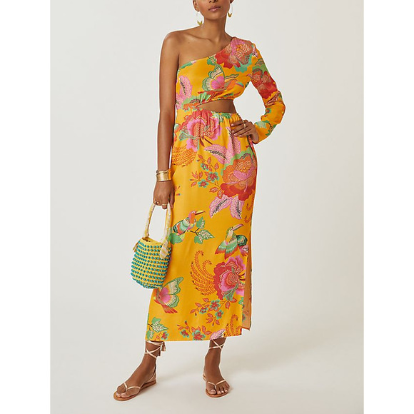 Anthropologie Farm X Orange Single-Shoulder Printed Maxi Dress Size XS PETITE: viscose, side zip hook-and-eye fastening, side cutout, ankle-length.