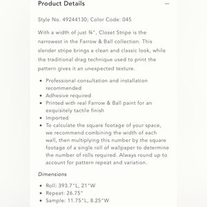 Anthropologie Farrow & Ball Closet Stripe Wallpaper NWT Defect