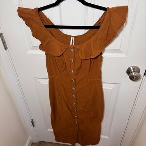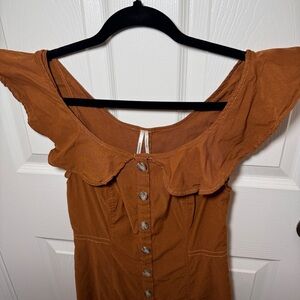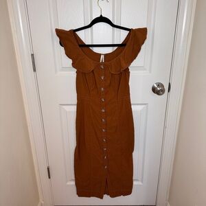 Faux button down midi dress from Anthropologie. Orangish brown color. Ruffle straps. Some stretch. Perfect to transition from summer to fall.