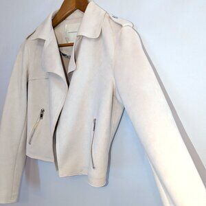 This faux suede moto jacket is a soft, feminine reinterpretation of a classic edgy silhouette.