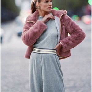 Anthropologie Faux Fur Lace Chevron Bomber dusty mauve Pink Long Sleeve Jacket S