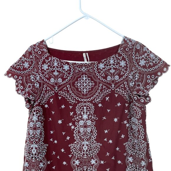 Anthropologie Feather & Bone Size S Embroidered Eyelet Ynez Dress Burgundy