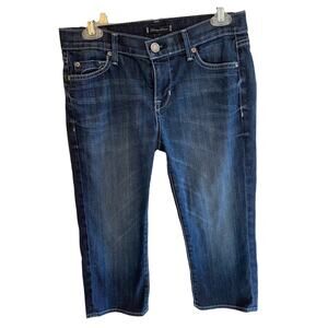 Excellent preowned condition. Medium wash mid rise straight leg jean capris. Zipper/button closure at waist. 5-pocket design. Made in USA. Cotton/spandex material. Approx. measurements: Waist 30”, Inseam 21”, Rise 9”. Size 27.