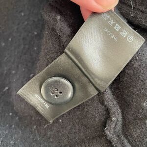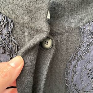 Anthropologie field flower bell sleeve 100% wool cardigan sweater Shacket. Hidden button placket and band collar with welt pockets at the hip. The sweater is made of 100% wool and the texture is like boiled wool. The lace overlay at the yolk front and back is midnight blue. The manufacturer retail price is $198 and they call the sweater blue however I think that is in reference to the lace because if the wool yarn is blue it presents as black, in my opinion. Lay flat measures 26 inches shoulder two hem and 22 inches armpit to armpit