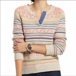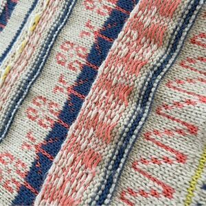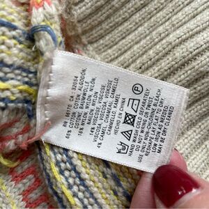 Anthropologie Fiets Voor 2 Orange Mott Sweater with split neck and modern fair isle pattern and shades of beige, salmon, pink, blue and yellow. Laying flat measures 24 inches shoulder to hem and 18 inches armpit to armpit. Size tag has been removed. However, this is a size small but please double check measurements to ensure the proper fit for you. Cotton, nylon, viscose, and camel blend.