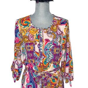 Vibrantly colored Paisley print lightweight material shirt dress. Buttons at chest. Detachable tie sash. Lined.