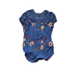Anthropologie Fig & Flower Blue Embroidered Button-Up Short Sleeve Top L