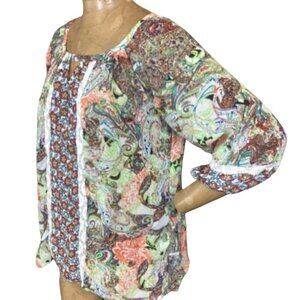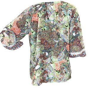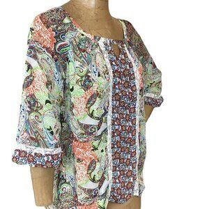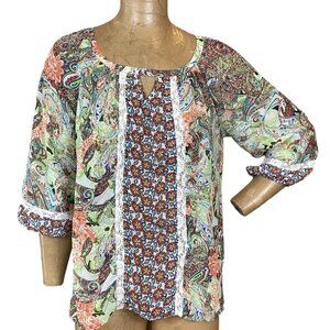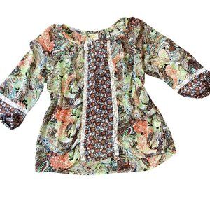 Add a pop of color to your wardrobe with this Anthropologie Fig & Flower peasant blouse. The relaxed fit and lightweight, semi-sheer fabric make it perfect for summer and spring occasions, from casual outings to business meetings to cocktail parties. The blouse features a round neckline with a keyhole neck and 3/4 balloon sleeves with lace inserts for a touch of elegance. The floral paisley pattern adds a bohemian, gypsy, and hippie vibe, making it a perfect choice for a 60s or 70s festival or peasant-inspired outfit. This blouse is available in size PL and is made of a polyester blend fabric. Hand wash only for best results.