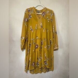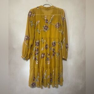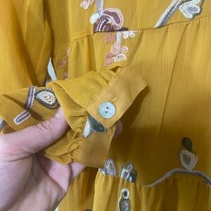 feminine, tiered, floral, embroidered, mustard, spring, summer, fall, boho, peasant, prairie, cottage, relaxed, oversized, sheer, semi sheer, festival, wedding guest, church, brunch, date night