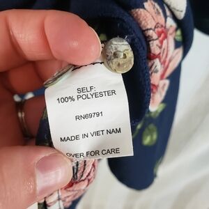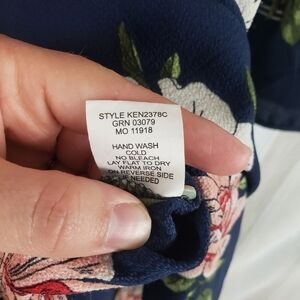 Excellent condition, rounded hem, cutouts at sides, navy blue with floral pattern.