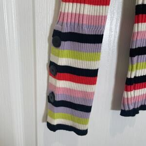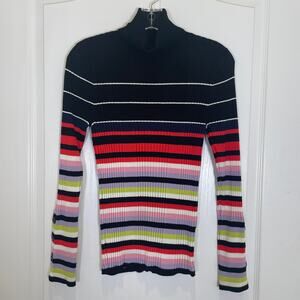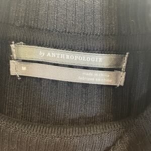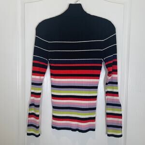 Black, white and multicolor striped fitted ribbed turtleneck top by Anthropologie. Features buttons accents on sleeve cuffs. Second pic shows the top in a different color scheme - shown for style/fit. Fabric is a stretchy rayon and nylon blend. Excellent pre-owned condition. Bust across the front area measures approx. 13.5 inches (unstretched).