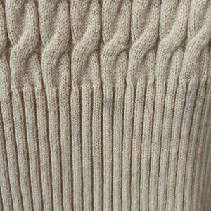 Great basic super soft and warm tan beige neutral color long sleeve high neck cable knit pattern. Very flattering. So many compliments!