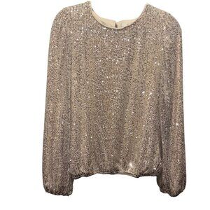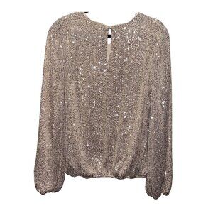 This sequin-embellished top features a sophisticated design, perfect for polished styling. The keyhole back and blouson sleeves add refined elegance to any wardrobe.