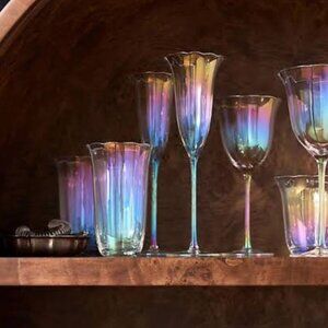 The Fleur glassware collection showcases iridescent soda lime glass with delicately scalloped rims, offering a touch of sophistication and shimmer to any table setting. Each piece in the collection reflects light beautifully, creating a subtle, elegant glow that enhances both casual and formal dining experiences.