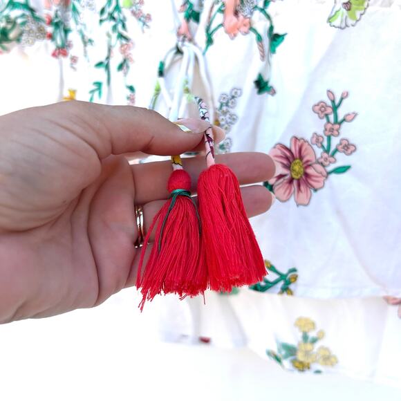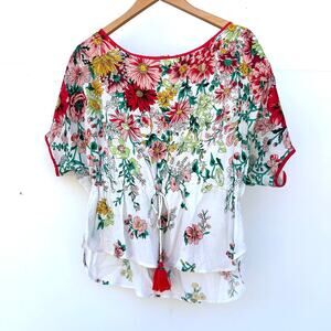 This Anthropologie floral cotton blouse embodies breezy femininity and effortless style. The cinched waist flatters every shape while the tassel drawstring adds playful detail. Perfect for sunny days or garden parties, this boho-inspired top pairs beautifully with denim, linen shorts, or skirts. A romantic, airy staple that transitions seamlessly from brunch to vacation wear.