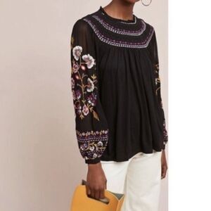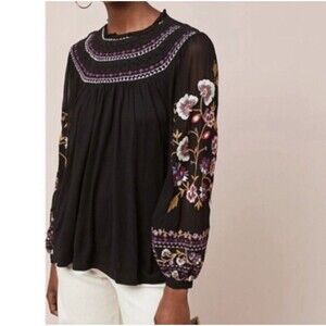 Anthropologie Floral Embroidered Blouse Small Sheer Puff Sleeves Boho Whimsigoth